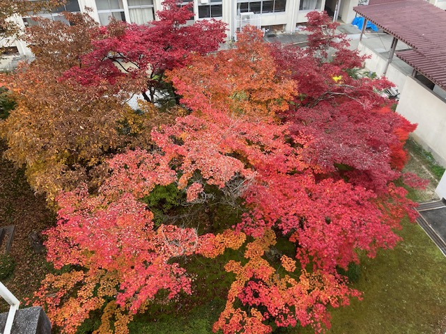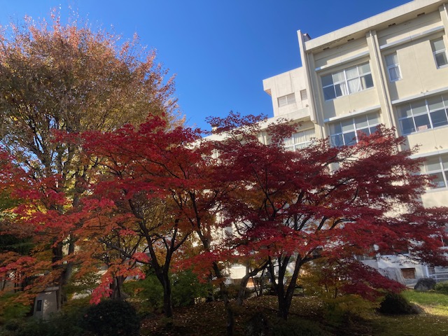 中庭の紅葉は毎年大変美しく、生徒や職員はもちろん、訪れたお客様の目を楽しませてくれます。「飯田ブルー」と呼ばれているという、抜けるような青空もまた実に美しく、色づいた木々とのコントラストが印象的です。