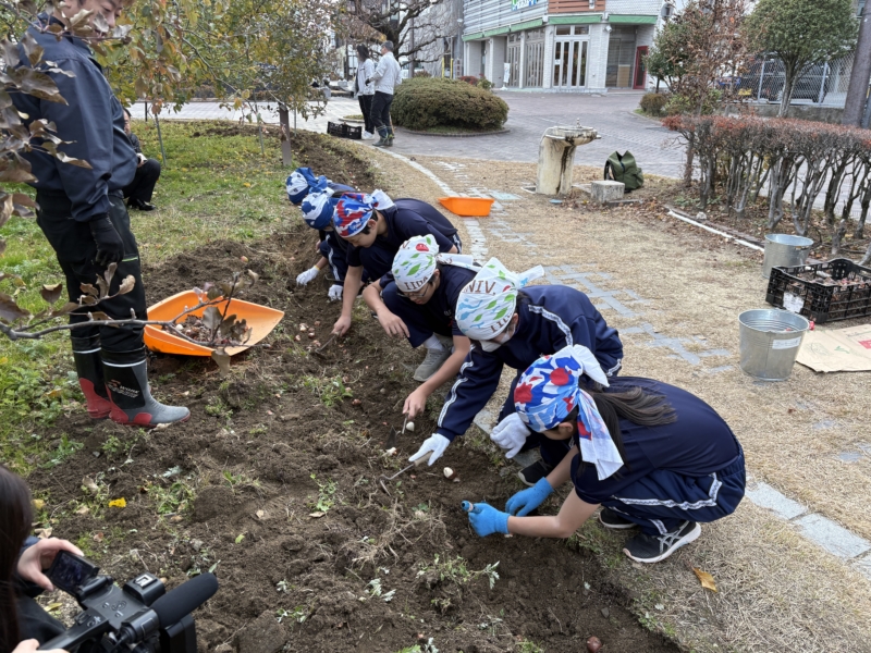 今回植えたのは、チューリップの球根とパンジーの苗です。用意してくださっているのは、りんご並木に花を植える会(島田洋治代表)の皆さんです。生徒が到着する前から準備をしてくださり、私たちの活動を支えてくださいました。ご協力ありがとうございました。