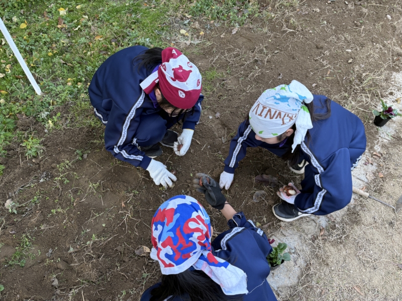 12月2日(火)青空の下、1年生生徒による並木チューリップ球根植え作業が行われました。これから先輩として飯田東中学校の「中核」となる1学年の生徒が毎年担当している背景には、先輩として並木作業を支えていく自覚を高める機会の1つになってほしいという願いがあります。翌春のりんご並木が色とりどりのチューリップやパンジーできれいなに彩られるように、願いを込めて丁寧に花を植えました。1年生は現在、学年学友会で委員会ごとに目標を立てて日常生活の向上に取り組んでおり、今日の目標は、「効率的に作業に取り組むために、集中して、黙々と作業に取り組む」ことでした。多くの生徒が目標達成している姿がみられました。