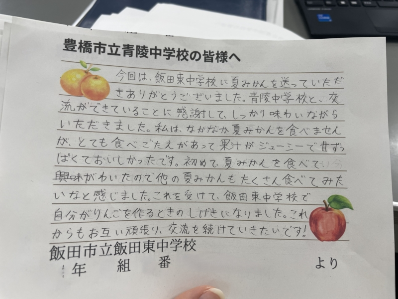 本校のりんご並木と豊橋市立青陵中学校の夏みかん並木には長いご縁があります。